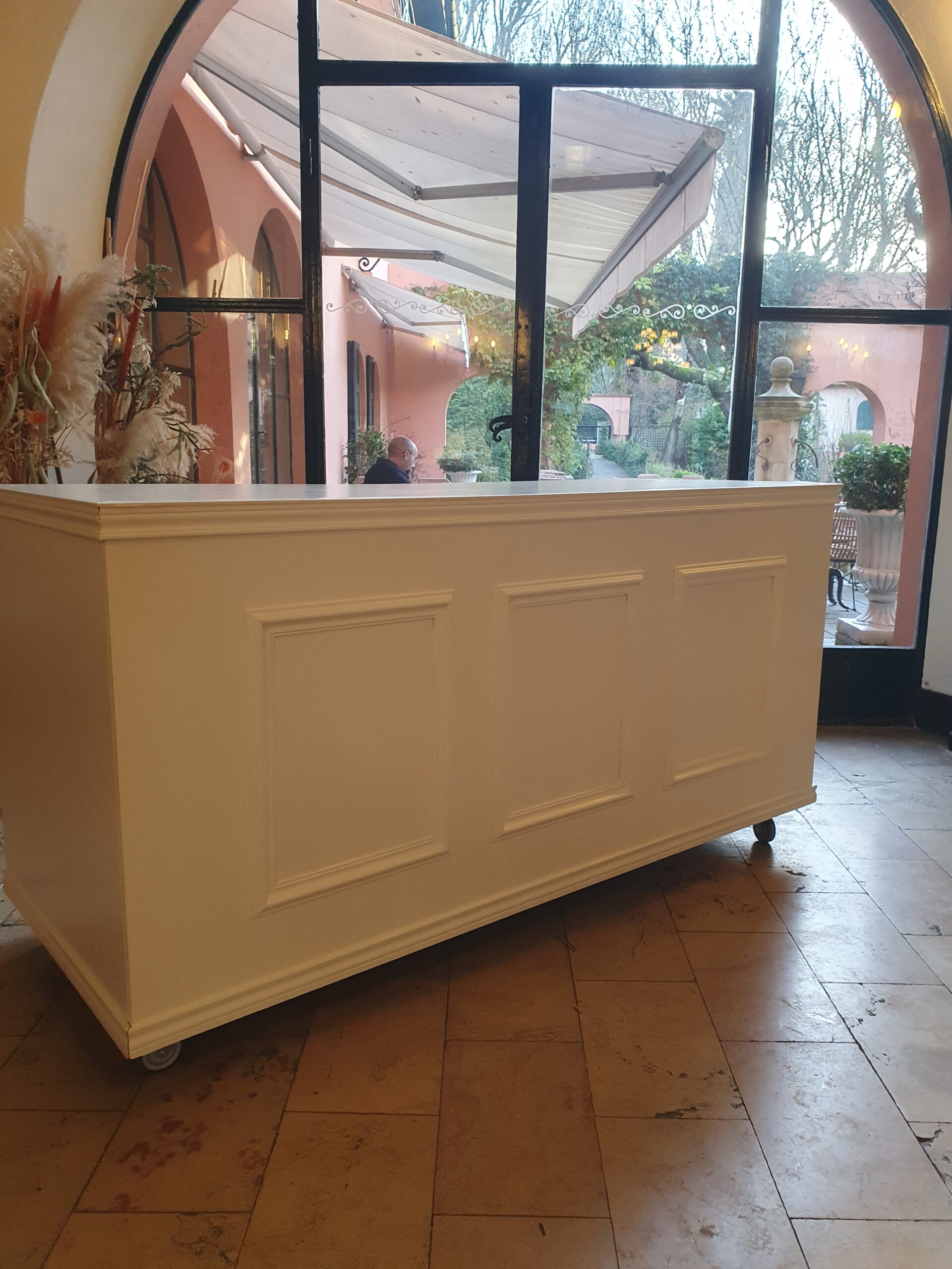 Sublimez votre poste boisson ou vos ateliers traiteurs avec ce bar blanc avec des moulures.